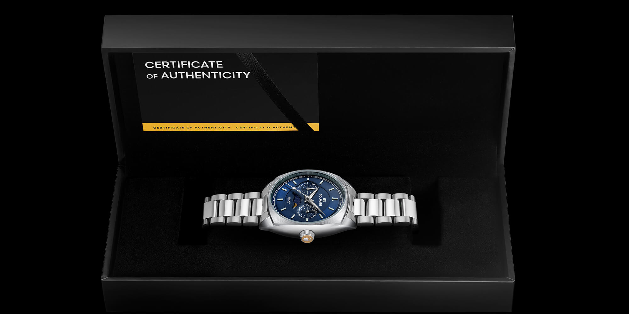 This Mondphase watch has a diameter of 38 mm and comes with a Edelstahl bracelet. The index and hands have a luminous coating so they become visible in the dark (see image for reference). The watch will be delivered in a giftbox so you can easily store it.