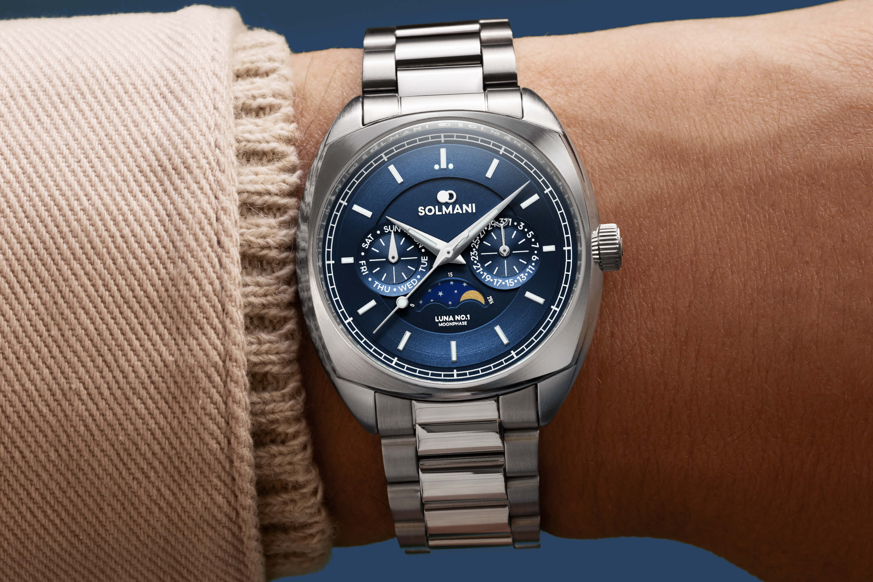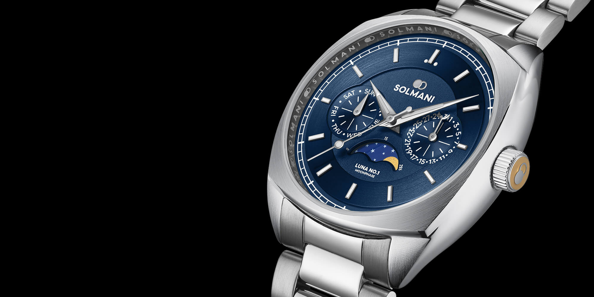 Mondphasenuhr mit blauem Sonnenstrahlen-Zifferblatt und silbernem Edelstahlarmband.