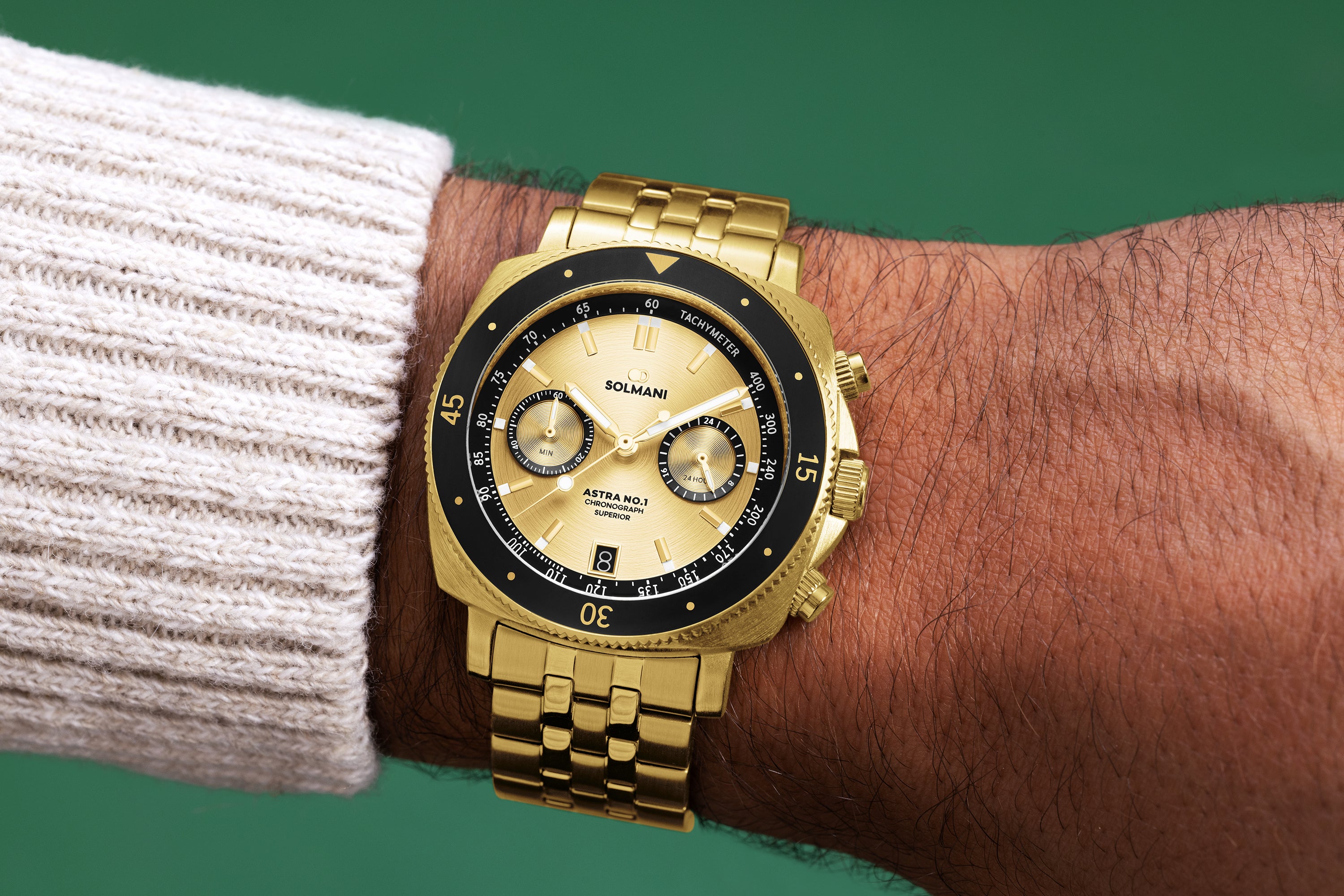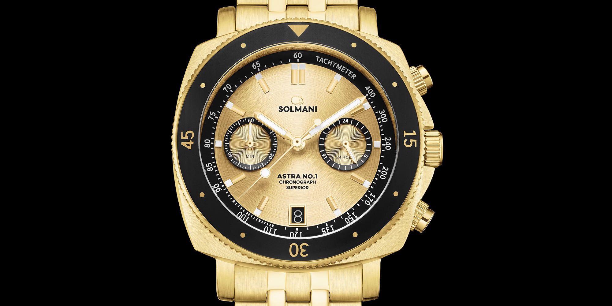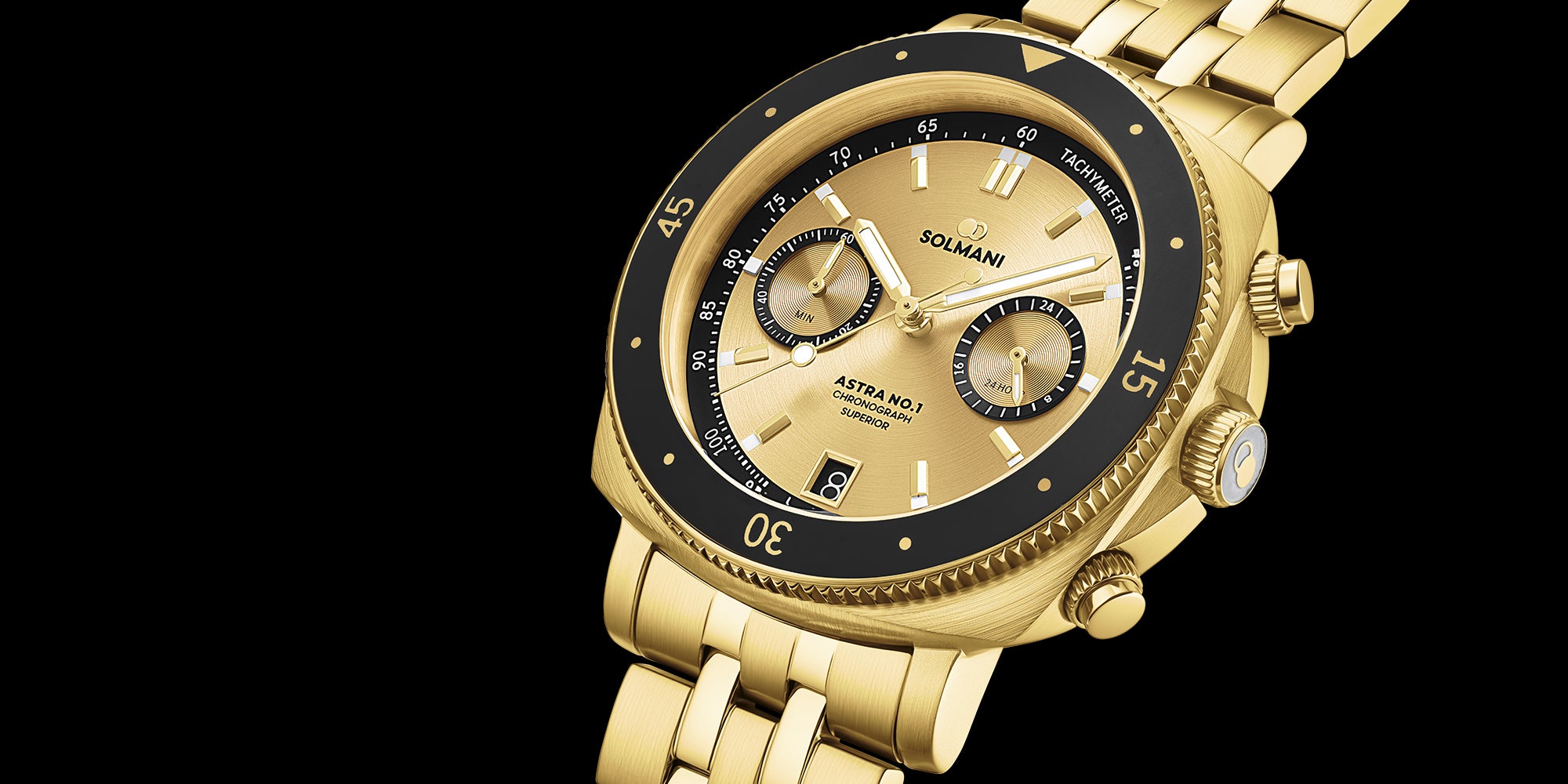 Chronograph watch with a date function, golden dial, luminous hands and index, combined with a golden stainless steel bracelet.