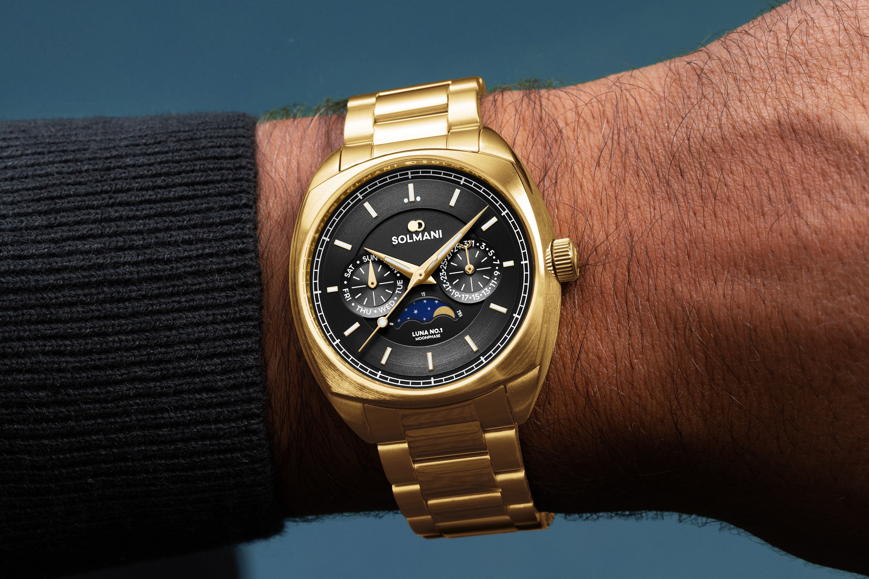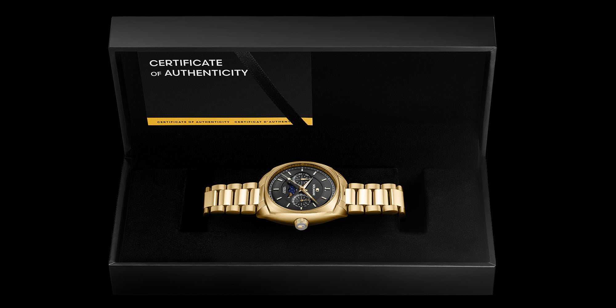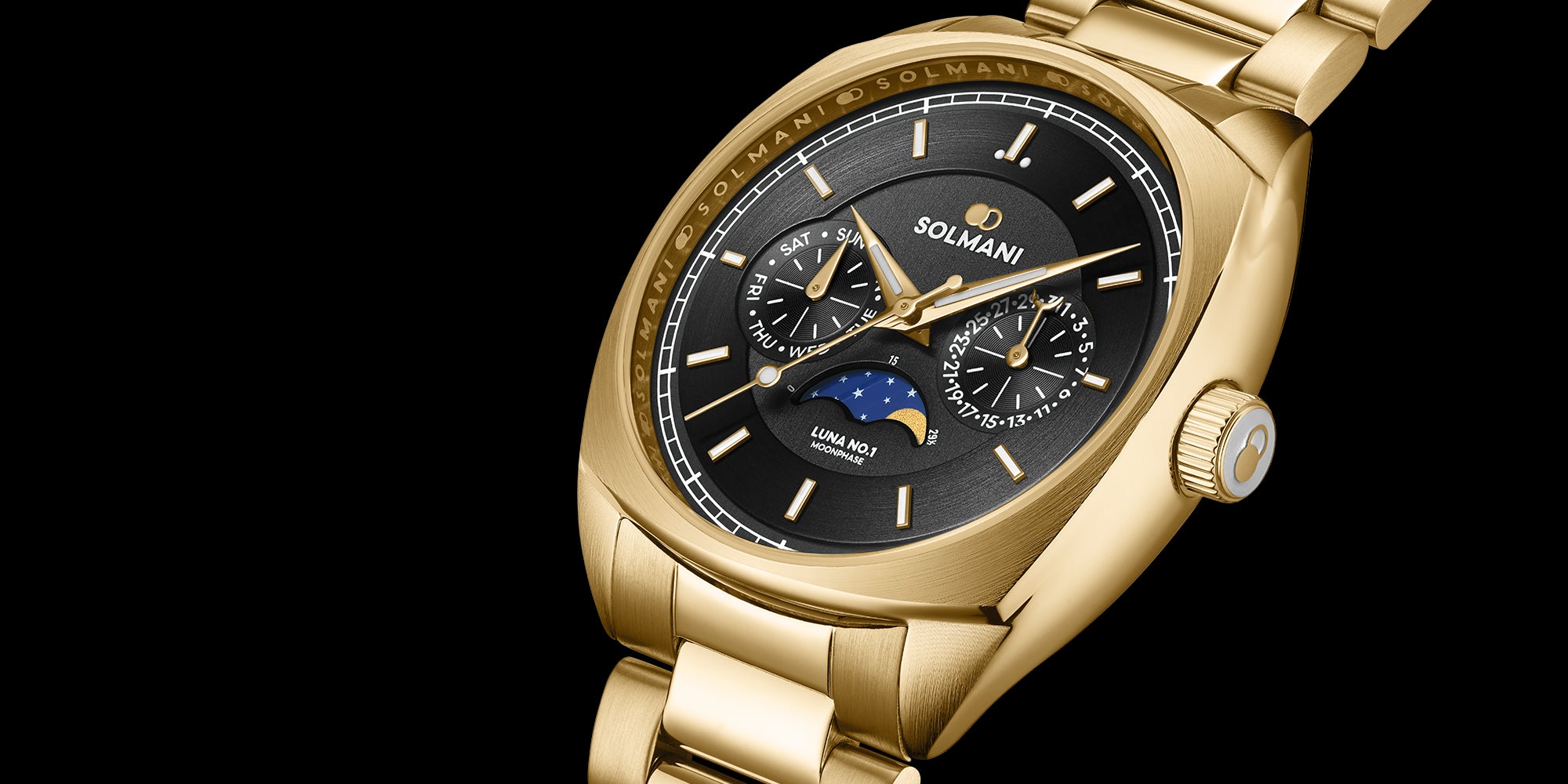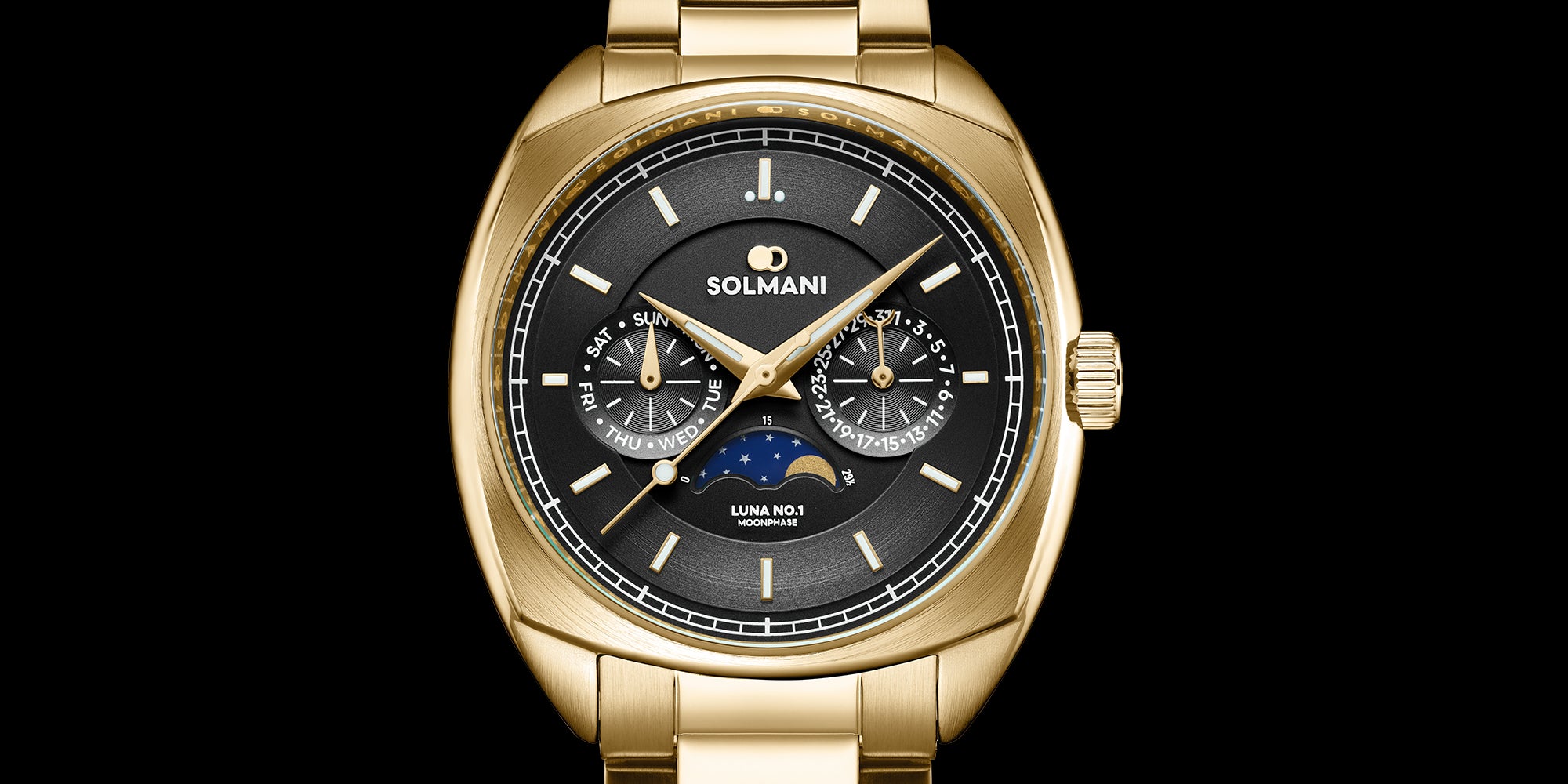Moon phase watch with black sun ray dial, luminous hands and index, combined with a golden stainless steel bracelet.