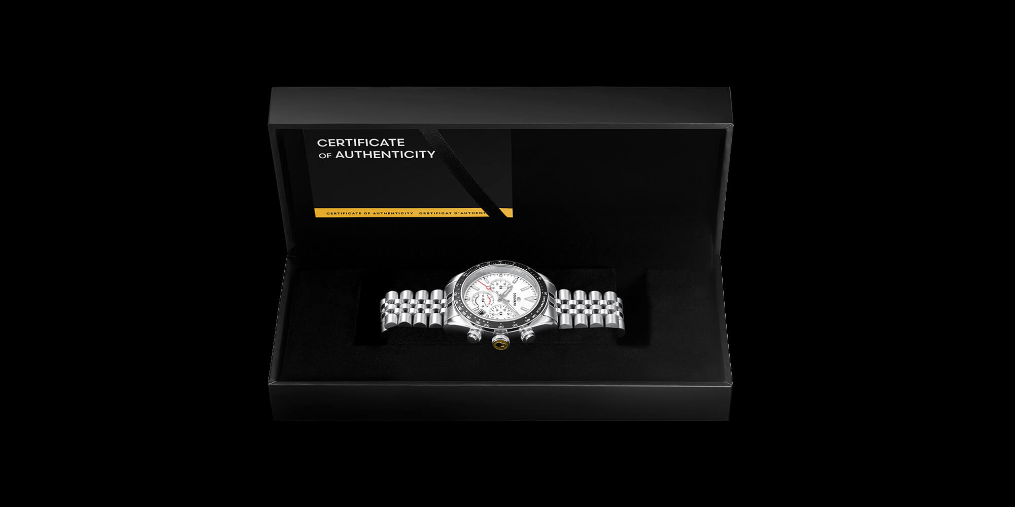 Chronograph mit weißem Zifferblatt mit genarbter Struktur, leuchtende Zeiger und Indexe, kombiniert mit einem silbernen Edelstahlarmband.